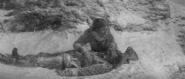 We’ve had occasional cutaways to the monastery, where Helen waits in fear, and we get another now, as Kusang stumbles into the courtyard, exhausted and terrified. He is quickly hustled away, but Helen knows what she saw and goes after him in spite of Fox’s protests. She gets lost within the winding corridors of the monastery, and is finally seized by the Lhama’s servant (the closest thing this film has to a traditional shock moment). When she comes to, she is in the care of the Lhama, who tries to persuade her that she is mistaken about Kusang. Helen stands her ground, insisting that the climbers are in danger, and that the Lhama must do something. He agrees to the first part of this, but not the second, saying calmly that John’s fate, all the men’s fates, are in their own hands, and will be determined by their own actions.