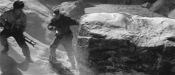 The slogging-through-the-snow portion of The Abominable Snowman now begins in earnest, relieved by some admittedly spectacular mountain scenery. The first intimation of trouble comes in the form of three men, who seem to be following the climbers at a distance. As the party moves out into the open, a shot is fired—though how close it gets, we cannot tell. A return of fire frightens the followers away. Rollason has gotten a good look at them through his binoculars, however, and views with suspicion Kusang’s insistent cries that they are bandits, bandits…