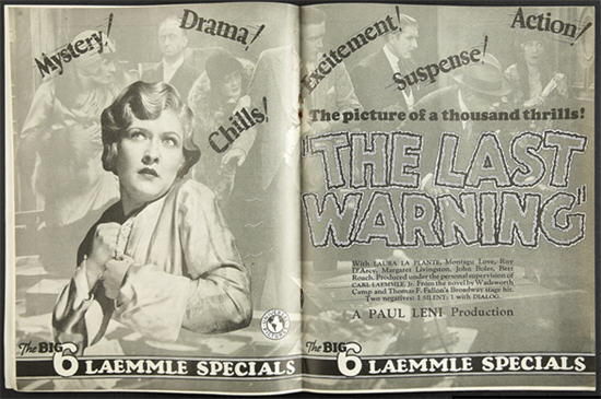 However, by the time that The Man Who Laughs – a silent film – was released, it was November of 1928. The Jazz Singer was already a year old; The Lights Of New York, the first all-talking picture, had premiered in July of that year (“It’s hear!” proclaimed the posters); and studio executives were getting increasingly nervous. At Universal, Paul Leni, visual artist supreme, was instructed to turn his new film, The Last Warning, into a part-talkie.