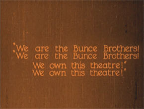 Sometimes he plays with the font, increasing the suspense of a scene with “shouting” text: “CURTAIN!” comes the cry after Woodford’s collapse; while later the characters’ danger is underscored with shrieks of “SMOKE!” and “FIRE!” The simultaneously-speaking Bunce brothers get doubled-up titles; the pomposity of the police lieutenant is summed up through his reiteration of “I, myself, personally”; and the increasing fear of various individuals as they come to believe that the theatre is haunted is conveyed through the wavering of the text.