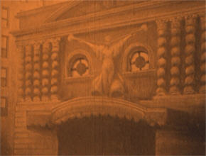Along with an engulfing tide of headlines – which melt away in another clever visual – we get one of the most remarkable episodes in the film, with exterior shots of the abandoned theatre that give it a distinct resemblance to a malevolent face, followed, upon its inevitable re-opening, by others in which blinds are raised inside behind its small arched windows…making it look as though the building is opening its eyes. It is impossible to watch this sequence and not think forward to The Amityville Horror.