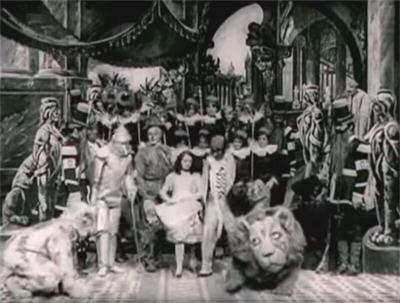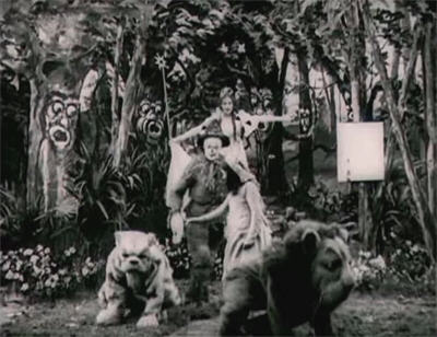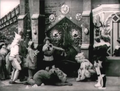 The film, running approximately thirteen minutes, is brisk to the point of incoherence. All the animals – with the exception of the brief appearance of a real Toto – are of the pantomime variety, and seem to be there chiefly to ensure that the image is never still for a moment. Whatever the main action of a scene, the animals will generally be capering on its fringes. Similarly, there is much exuberant action and dancing from Momba’s servants – tumbling black-clad figures that seem inspired by Georges Méliès, and others that are supposed to be flying lizards – and from the throne-room guards in the Emerald City (who, in the film’s most bizarre sequence, unionise). The acting is similarly energetic, consisting of constant wild gesticulation and much slapstick tumbling. The overall effect is rather exhausting.