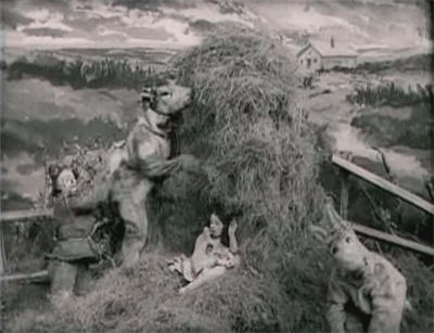 The plot of The Wonderful Wizard Of Oz is perfunctory at best, with lots of sudden leaps and unexplained actions—so you’ll forgive me if this recap contains frequent uses of words like “evidently” and “apparently”. Perhaps the oddest thing, dramatically speaking, is that Kansas turns out to be already populated with pantomime animals, and to contain a living scarecrow. While Uncle Henry, Auntie Em and the hands struggle with Hank the mule, Dorothy ends up in a cornfield, where the Scarecrow suddenly speaks to her. Recovering from her shock, Dorothy helps him down, and he immediately takes a tumble over a turnstile.