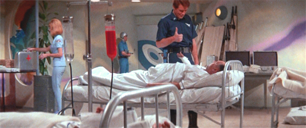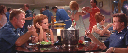 Rankin is just about due to depart, but first Gamma 3 throws a PAR-TEY, in that inimitable the-future-mutates-into-1968 way, as champagne corks pop, and dancers groove. Elliott’s announcement of his and Lisa’s imminent wedding prompts Rankin to haul her out on the dance-floor. At this point we learn details about the falling-out between Rankin and Elliott; and though Rankin conceded to General Thompson that he was the one who ruined their friendship, to Lisa he stands by his reporting of his friend, though it meant he had to face a Board of Inquiry.