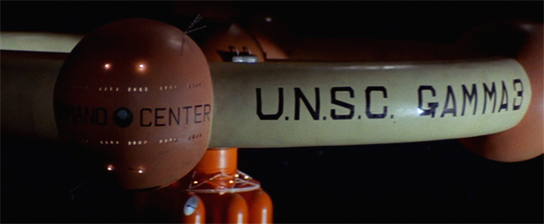 Gamma 3 is going about its normal functions, reporting on the weather, the position of satellites and probes, and astrophysical phenomena to the Cape Kennedy (!) Space Center…where we immediately notice something odd: the complex is emblazoned with “UNSC”, which presumably stands for United Nations Space Command; but don’t waste your time waiting for the non-Americans to show up. (Spoiler alert: there’s one – count ’em! – one.)