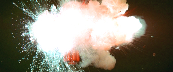 An enormous explosion rips through Gamma 3 – in fact, some overenthusiastic special-effects work initially suggests that it’s blown up altogether! – but when the [*cough*] smoke and flames clear, only about a quarter of the outer ring is badly damaged. (So the air-lock doors, which we were told couldn’t confine the creatures on their own, withstood this massive blast??)