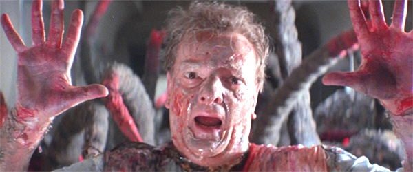 I must confess, I’m totally confused about the geography of the next scene, which shows us the team trapped between two air-lock doors, one of them jammed by a crashed cart. The dialogue suggests that shifting the cart (which they try to do) will somehow help Halverson—seen and heard in his terror on one of the monitors behind the other door. Eh? Of course Elliott insists on opening the other door, of course Rankin orders him not to, of course Elliott does it anyway—although not until Rankin has threatened to shoot him, he has turned his back defiantly on Rankin, and Lisa has placed herself in the line of fire.
