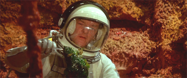 Once on Flora, the crew splits into three, each to place an explosive device; while Halverson’s attention is immediately attracted by patches of green, glowing goop. One patch of it is actually pulsing—which causes this [*cough*] highly-trained scientist to let drop the specimen he’s already holding, which splatters all over his equipment. When he looks back from poking and prodding the second one, the first one has grown up over the monitor on which it landed, and seems to be almost seething with life…