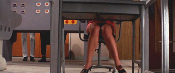 Inside the complex – as indeed is the case on Gamma 3 itself – we discover that in this far-flung future (a future which the film never dates for us, by the way), the female of the species has not yet managed to break through the glass ceiling. There are a few women working for the space program, but in extremely limited roles; while (with one exception) all the command positions, and all the military postings, are filled by men. The Green Slime takes pains to inform us of The Way Things Are In The Future in the very first shot involving a female character—who is introduced to us via a camera-shot up her skirt.