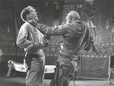 Inside, Petrie is replacing the tana leaves when a smooth voice speaks from the shadows. It is Andoheb, of course, who in fact has been lurking in the area for some time, and witnessed the breaking of the seal. Petrie is bewildered by the professor’s presence, and considerably more than bewildered when the sardonically smiling Andoheb begins an odd demonstration. First, he has Petrie feel for Kharis’s pulse—which he finds. Secondly, Andoheb pours a fluid that he describes as having been brewed from nine tana leaves between the mummy’s shrivelled lips. Kharis’s pulse rate increases…and then he stirs. His hand closes about Petrie’s wrist, and his eyelids lift—revealing the black, glittering pools beyond. Overwhelmed with terror, Petrie struggles unavailingly to free himself from the grip of the mummy, which takes his throat in one hand…