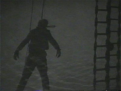 Outside, a terrified Bavian is trying to make his escape in the launch which Granted piloted to the yacht—looking over his shoulder as Ruth Rogen’s hysterical laughter pursues him. In his haste and his fear, he struggles to handle the ropes with which the boat is tethered, tangling them and becoming tangled. He looks up, recoiling as if from an incredible vision—