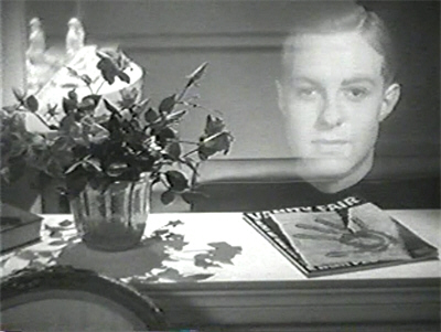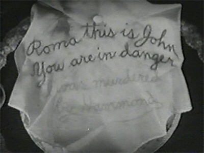 At the piano, the seemingly unconscious Bavian takes from his pocket a small portable projector—and suddenly the ghostly face of John Courtney appears in the darkness…