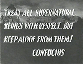 This background makes the opening of Supernatural even more striking: set against crashing lightning and raging seas, a series of titles offer passages to illustrate the fact that only do all religions believe in life after death, but that they believe to in the existence of malevolent undead beings. We get a quote from the bible, and another from Mohammed—and one from Confucius, apparently doing duty for all the rest (“Miscellaneous,” as Reverend Lovejoy would put it).