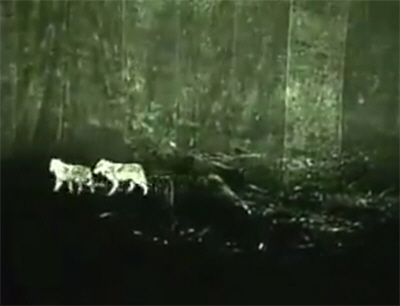 Or at least four rather attractive beasties, who are gambolling and panting and wagging their tails in a perfectly unthreatening manner, and paying no attention to Bannister whatsoever. Bannister therefore has the chance to limp away, but gets only a few yards before he collapses again. Not to worry: at this point the wolves all have their backs turned.