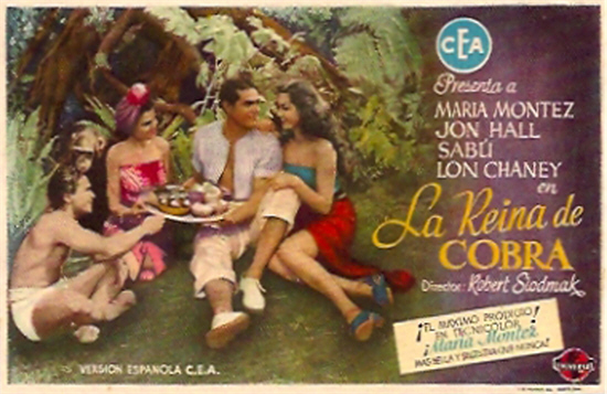 Cobra Woman was also the third re-teaming of Maria Montez with Jon Hall and Sabu, and her second with Edgar Barrier, after her two previous Technicolor pageants, Arabian Nights and White Savage (the latter also written by Richard Brooks!).