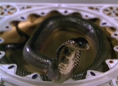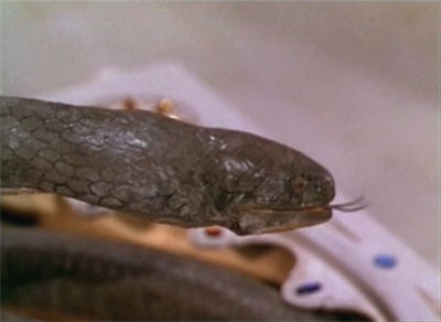 Meanwhile, Tollea’s confrontation with Naja ends not with the bitch-slapping we’ve all been eagerly anticipating, but with Naja’s accidental death without a hand being laid on her. Tollea’s subsequent attempt to rescue the condemned Ramu and Kado fails dismally when, upon being confronted by the cobra around which, as “Naja”, she is expected to dance, she faints dead away. It is then left to Koko the comic relief chimp to actually save the prisoners’ sorry asses (no, really); after which, it is Kado, not Ramu, who saves Tollea from the cobra, and Hava who disposes of Martok, the evil law-giver.