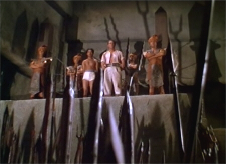 In comparison to Naja’s solitary splendour, what ought to be the other highlight of Cobra Woman – the confrontation between the two Montez-es – is a distinct letdown. Everything we know about the good twin / evil twin mini-genre – not to mention the usual workings of the male mind – leads us to expect a knock down, drag ’em out cat-fight when Tollea and Naja finally meet. What we get instead is a minor verbal altercation that terminates with disappointing abruptness when Naja, lining up her sister with one of the spears that she likes to keep handy, forgets herself and backs a little too close to an exceedingly low balcony…