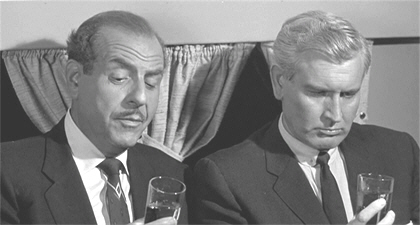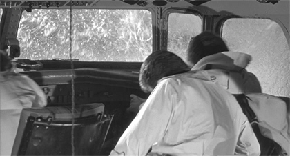 The low budget also works against the success of the film, with Flight #627 rendered via some questionable model-work—which, moreover, uses the wrong kind of plane (it’s supposed to be a DC-7, but the model used is of a DC-6). During the rescue sequence at the end, careless set-ups and angles give away the fact that this footage was photographed in the safety of a swimming-pool—the edge of which can be seen in the background of some shots. Furthermore, the tiny cockpit may be technically correct, but the necessity for the flight-crew to climb over each other every time someone leaves – which is often – is terribly distracting. The set used for the cabin of the plane is more realistic, and also more interesting—inasmuch as it seems to be the same one used in Zero Hour!