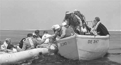 The emergency exits are thrown open and the inflatable rafts deployed. The passengers scramble out, climbing awkwardly into the rafts. As they push away from the floating plane, the launch from the destroyer arrives.