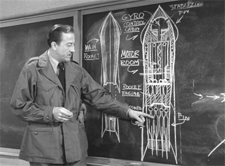 Part of the press interview sees Karl Eckstrom demonstrating the design of the RXM and its proposed trajectory—and here we have one of the rare moments where this film manages to outdo its model. One of Destination Moon’s few real errors lies in the design of its ship, the Luna, which is a sleek, finned, single-stage rocket bearing little resemblance to the multi-stage vessels that would finally take man to the moon.