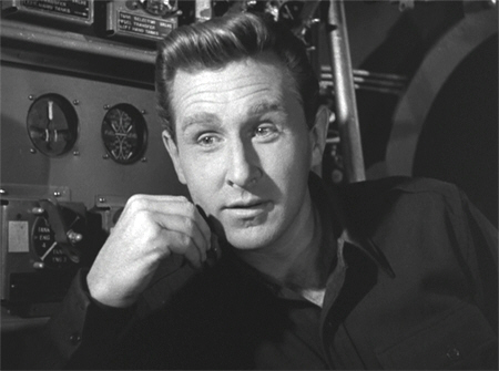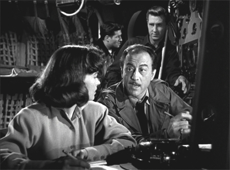 Rocketship X-M, whether by design or coincidence, features an OCR© as well, with Noah Beery Jr’s Bill Corrigan putting in a concerted effort to make Texas the second-most hated place in the science fiction universe, right after Brooklyn. Hugh O’Brian’s Harry Chamberlain is, only too obviously, the team’s weak link. Sure enough, when trouble strikes it is Harry who frets out loud about the strain upon the oxygen and fuel supplies; Harry who ponders, after the meteoroid shower, whether sudden death might not have been preferable to their threatened slow extinction, lost in space (so to speak). Not that any of this was necessary: from the moment that Harry’s lower lip quivers as he waits for the RXM to take off, the experienced space film watcher just knows he won’t be making it home. Karl Eckstrom, scientist and expedition leader, is not without his points of interest, as we shall see; but it is with respect to the remaining two characters and their interaction that Rocketship X-M bestowed, for better or for worse, a permanent legacy upon the science fiction films to follow.
