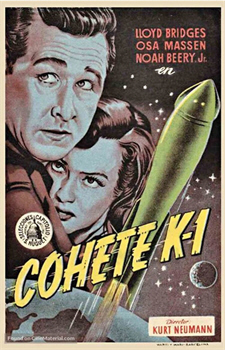 Synopsis: An audience consisting of representatives of all American news services listens in amazement as Dr Ralph Fleming (Morris Ankrum) announces that within mere minutes, a manned rocket, the RXM, will be launched into space; its object—the moon. Dr Fleming introduces the rocket’s crew: expedition leader, ship designer and physicist Dr Karl Eckstrom (John Emery); Eckstrom’s assistant, chemist Dr Lisa Van Horn (Osa Massen); Colonel Floyd Graham (Lloyd Bridges), the pilot; astronomer and navigator Harry Chamberlain (Hugh O’Brian); and engineer Major William Corrigan (Noah Beery Jr). Addressing the audience, Dr Eckstrom explains details of the rocket’s design and its flight plan. The reporters are then permitted to interview the crew. When one of them questions the inclusion of a woman, Dr Eckstrom quickly interjects that it is Dr Van Horn’s pioneering research that has led to the development of the ship’s experimental fuel, without which the mission could not be undertaken. As the time for the ship’s launch is reached, Dr Fleming and Dr Eckstrom share a reflective moment, marvelling that after so many years of planning and work, their dream is about to be realised. The crew boards and prepares for lift-off. From the observation bunker, Dr Fleming, his team and the reporters look on in awe as mankind’s first manned rocket hurtles into space… The flight proceeds as planned until the ship reaches escape velocity, and its tail section is jettisoned: a collision between the ship and the tail is narrowly avoided. Eckstrom makes the final possible radio report to Earth; Fleming listens in mingled excitement and apprehension as his colleague’s voice fades into nothingness… As the ship travels into the unrelieved darkness of outer space, the crew members find themselves dealing with the effects of reduced gravity. Floyd Graham tries to flirt with Lisa, but she is unresponsive. Frustrated, Floyd questions why a woman would want to involve herself in space travel in the first place. Before Lisa can answer him, a strange grinding noise echoes through the ship. The next moment, all power has been lost. Bill Corrigan pressurises the motor-room so that he and Floyd can inspect the engines, but they find nothing wrong. Eckstrom concludes that the problem must be the fuel mixture. He and Lisa sit down to re-check their calculations, a process that ends with the two of them in disagreement. Eckstrom insists upon using his own figures, dismissing on the grounds of a lack of time Lisa’s urgent plea that they try both sets of calculations, and ignoring her warning that the experimental fuel can behave unpredictably. Floyd and Bill reconfigure the fuel tanks. The crew-members brace for the re-start, but are unprepared for the ship’s reaction to the new mix. Uncontrolled acceleration throws them violently across the cabin, leaving them unconscious, and the RXM travelling through space at unchecked velocity…