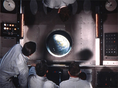 From the start, the project was undertaken with the utmost seriousness. Specialist consultants were brought in to ensure its authenticity, most notably Hermann Orbeth, an expert on rockets who had previously worked with Fritz Lang on 1929’s Die Frau Im Mond (the only other “realistic” space flight film made to that time), and Chesley Bonestell, the astronomical artist whose glorious paintings and illustrations did so much to bring “outer space” into the collective American consciousness during the late forties and early fifties. Together with Pal and Heinlein, these men managed to instill into their other collaborators their own belief in the realities of space flight, and to have Destination Moon produced under a policy of accuracy above all. The results of this mindset are evident throughout the film, which not only illustrates what was known at the time of its production, but is also startlingly prescient about the things that would happen when man finally ventured into space.