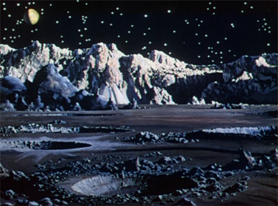 And despite all the expert input, there are a few design flaws in Destination Moon. The worst of them is the painfully unconvincing “star fields” with which the Luna is surrounded at all times. These were actually realised using car headlights—and unfortunately, look like it. The “stars”, almost identical in colour and intensity, and closer together than real stars ever were, are a major distraction throughout the otherwise well-executed EVA sequence. Another mistake, a more surprising one, is Chesley Bonestell’s design for the surface of the moon, which looks like a huge dried lake-bed, all dramatic cracks and geometric patterns. Bonestell himself afterwards lamented his error, claiming, not that he could have known what the moon looked like, of course, but that he could have deduced it. Be this as it may, Bonestell’s paintings are one of the true highlights of Destination Moon, and even if his moonscapes are wrong, they’re such a pleasure to look at that we have no trouble overlooking the fact.
