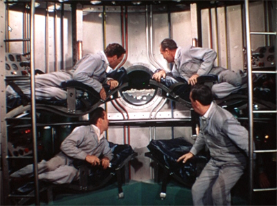 (Given that the time of Destination Moon’s production was also that during which the U.S. government commenced its program of secret experiments, in which uninformed individuals, both military and civilian, were deliberately exposed to radiation, these scenes are rather chilling. Nor does “the Commission”’s suggestion that the crew shift the atomic engine test to “the South Pacific” make things any better, given the radiation exposure suffered both by the indigenous population and by U.S. servicemen during the atomic testing in the Marshall Islands.)
