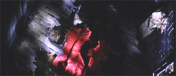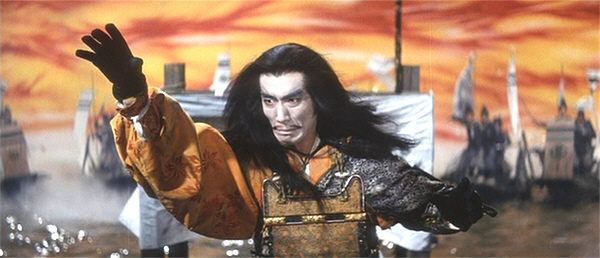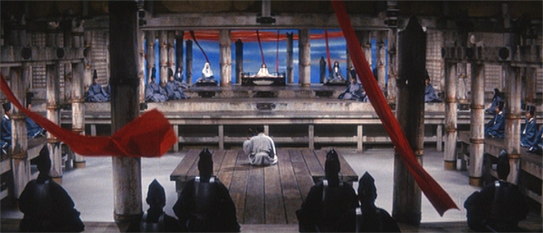 Kwaidan’s presentation of the battle is highly stylised, almost like a Kabuki performance, with formal, deliberate movements and a distinct lack of bloodshed; in this version, the child-emperor dies when his nurse jumps with him into the churning red waters around his ship. Nevertheless, the totality of the slaughter, and the magnitude of the defeat of the Heike, is conveyed to the viewer. The entire set-piece is perversely beautiful, full of intense colours and contrasts, and with scenes featuring actors intercut with shots of a scroll painting depicting the decisive battle, and which is far more gruesome than the live-action battle.