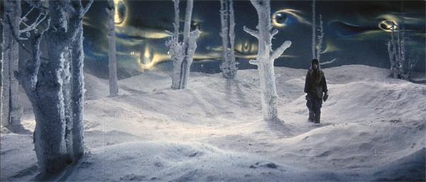 The external sets built for The Woman Of The Snow are also striking—and creepy. Most notable is a strange interlude while Minokichi is staggering through the snowstorm with Mosaku, his elderly master: suddenly he finds himself in the clear, but alone, and under a sky full of heavenly bodies that resemble eyes; eyes gazing down upon him… This motif recurs at the story’s sad conclusion.