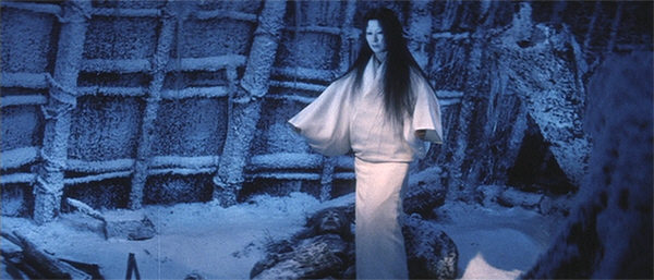 The Woman Of The Snow is simultaneously the most artificial, the most beautiful and the most disturbing of the four stories in Kwaidan. Its removal, in early prints shown to non-Japanese audiences, must have robbed the film of much of its emotional resonance. It is a story of contrasts, the chilly blue-and-white mise-en-scène of Minokichi’s encounter with the snow-spirit in jolting contrast with the almost lurid yellow and red and pink that suffuses the scenes of his courtship of Yuki.