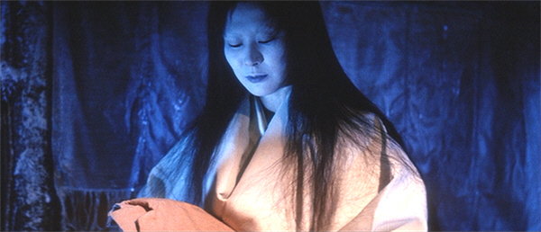 The yuki-onna is another Japanese spirit, one which lurks in the snow, or may in fact be of the snow. Though some versions allow that the yuki-onna does not always pose a threat, others depict the snow-spirit as malevolent, often preying upon unwary travellers. Kwaidan gives us both: almost ironically perfect in human form, the yuki-onna is a genuinely uncanny presence in the bookending scenes. Most unnerving of all is the film’s ambiguity about what, exactly, the snow-spirit does to the old man. Minokichi sees her enveloping him in her icy breath, and he is found frozen as well as dead; yet we are later told there was no blood in his body. But if this yuki-onna is a vampire, she is not a conventional one: as she leans over the terrified Minokichi, her lips part—showing only darkness beyond…
