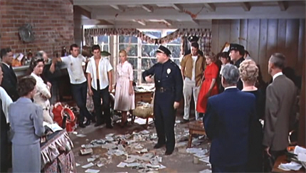 The other startling moment is Dick Jr’s teenage rebellion, when he becomes one of a group – gang? – caught vandalising a house. This is a weird, split-visioned moment, hanging on the precipice between the 50s and 60s: the kids themselves are rather unconvincingly dressed-down, and despite that clearly the children of privileged suburbia; yet according to the police, they’ve been guilty of breaking and entering, trashing the house in question, and unspecified activities that required, “Pushing the mattresses together.” Barnett is one of the mortified parents summoned to the scene.