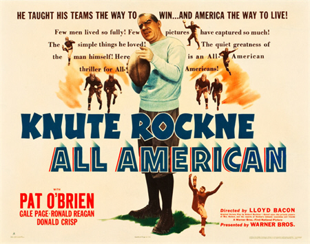 The rest of Knute Rockne All American is devoted to a dash through Rockne’s coaching career and his influence upon the game of football. The film follows him through his years of staggering success as Notre Dame’s head-coach and his introduction to the game of such innovations as the forward-pass-based offence and the backfield shift. It also shows him as a role-model not just for the young men he coached, but for young men all across America: propagating a personal code of honesty, clean-living and hard work.