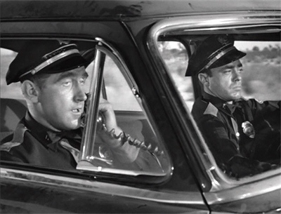 Peterson receives this offer gratefully and departs. He has been gone only moments when the Blackburn hears the same high-pitched sound as earlier, near the trailer. Understandably apprehensive, the young cop unholsters his gun, switches off the lights and turns off the radio, waiting for—he doesn’t know what. He ventures out into the night—where he confronts something at which he fires his gun unavailingly…and then screams in terror and agony…