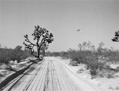 A small plane crosses the sky as a State Police patrol car drives along a dirt road. The three officers are following up what seems an improbable report of a child wandering alone in the desert. Just as they are about to call off their search, the pilot does indeed spot a young girl walking alone some distance from the road. Under the pilot’s direction, the patrolmen spot her; Sergeant Ben Peterson jumps out of the car and calls to her but she pays no more attention to him than she did to the circling plane, continuing to stare straight ahead of herself as she moves in a straight and rather hurried line.
