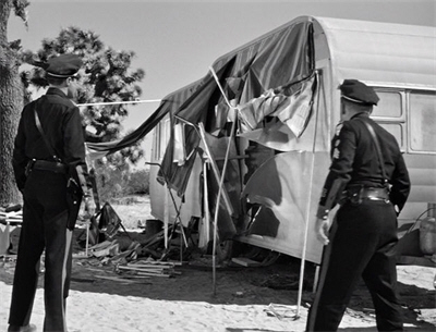 At their destination, the police officers find a scene of devastation and mystery. One side of the trailer has been completely ripped open, and the inside is wrecked. No occupants are present, but Peterson grimly observes some torn and bloody clothing and a fully discharged handgun. He also finds some banknotes scattered about, suggesting that whatever happened, the motive wasn’t robbery.