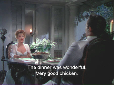 By this time, Joanna has no difficulty at all in interpreting this remark, and although intensely amused, she contents herself with saying drily, “Well, whoever selected them for you has very good taste.” At length she induces him to ’fess up, which leads to a quotation from Jean de la Fontaine (albeit one invented by the screenwriters), and an apology for everything in general, and tonight’s behaviour in particular: “I don’t like what’s happening to me. I tried to embarrass you. I’m not like that, usually.”