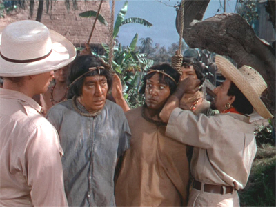 The Commissioner is one of them; the second, another planter called Gruber, who has come looking for two of his workers who ran away—and who he can recognise from the whip-marks on their backs. Leiningen calls his bluff, claiming that the men in question are guilty of murder and he was just about to have them hanged…and he starts to go about it, too, forcing the Commissioner to intervene and insist that the men go to trial.