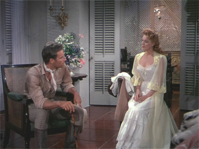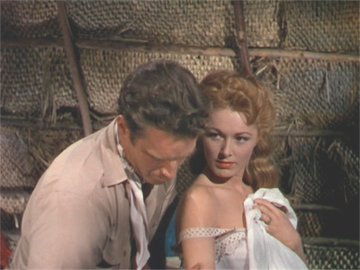 The boat’s other passenger, the District Commissioner (a lovely supporting performance from William Conrad), is an appreciate witness of this scene. He reveals that he knows all about Joanna and the circumstances of her marriage, as he not only stood in for her during the proxy ceremony, but performed it. Joanna is amused, and asks him if he will be stopping at the plantation which is her destination. The Commissioner replies briefly that he cannot stop, as he has business further up-river, and then evades her questions about her as-yet unseen husband.