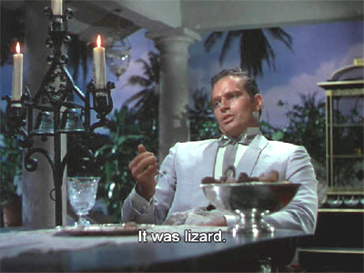 Oh, yes, I remember that. I remember cringing back in my armchair with my knees tucked up under my chin, clamping my hands over my face while making whimpering noises like a puppy. This is, in fact, one of the films to which I attribute my lifelong horror of eye-violence; although perversely, this has had the effect of increasing rather than dissipating my affection for it. Over time The Naked Jungle became one of my family’s “pet” films, as indicated by the entering of some of its dialogue into our vernacular. (Particularly one dinner-table exchange, for reasons that will become obvious.)