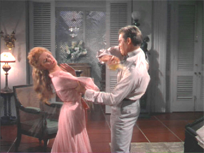 At this point Joanna tries to beat a strategic retreat, but Leiningen grabs her by one arm, swings her around and douses her in the offending scent. (This moment was, evidently, improvised by Charlton Heston, and Eleanor Parker’s shocked reaction is entirely genuine.) Then he drags her into his arms and forces kisses on her as she stands motionless and rigid, neither responding nor resisting, but with her eyes filled with contempt. This lack of reaction cools Leiningen’s brandy-fuelled ardour, and he pushes her roughly away.