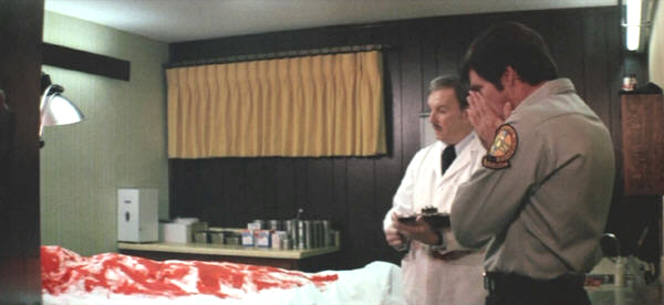 Cut to a hospital. Oh, goody! – a gruesome coroner’s scene! Haven’t seen one of those since, ooh, let me think… There’s no disagreement this time, though: the doctor (played by Charles Kissinger, who also played the doctor in Abby) simply confirms the cause of death, going on to suggest that the victims got between a mother bear and her cub—this being (as the script doesn’t make clear) the scenario most likely to result in a fatal bear attack. Kelly isn’t convinced. “Bears don’t eat people!” he protests. “This one did,” replies the doctor helpfully.
