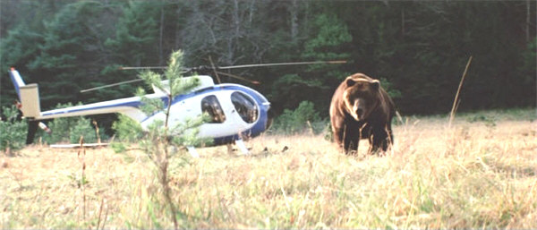 The film opens with a helicopter flight over some lovely scenery, with Don Stober lecturing a “senator” and his unidentified companion about the necessity of conserving the area from further human encroachment. This sequence turns out to have nothing to do with anything, but it is very pretty. (It is also accompanied by some wonderfully inappropriate “pastoral” music, played by no-one less than the London Philharmonic Orchestra. I’ve always wondered if they knew what their music was destined for.) The shooting of Grizzly went from November into December; the many the aerial shots were captured before principal photography began, in order to make things look more autumn-y, and to justify the huge numbers of visitors still populating the park.