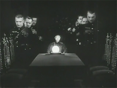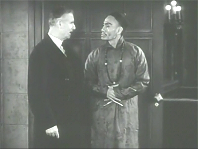 The rest of The Unholy Night unfolds at the palatial London home of Lord Montague. After more would-be comical jabbering from his lordship, this time about the haunting of the Montague family by a greenish spectre, which presumably had more bearing on things in the Hecht short story but really doesn’t come into it here, there is a diversion of a more serious and effective kind when, upon hearing moans and groans from the music room, the Scotland Yard men rush in to find a spectral face floating in the dark—and interrupting a séance organised by Lady Vi Montague, much to her indignation. As the attendees depart, Inspector Lewis casts a suspicious eye on the medium, Lee Han, whose history he knows.