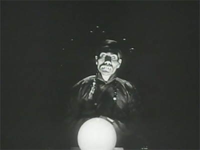 The rest of The Unholy Night unfolds at the palatial London home of Lord Montague. After more would-be comical jabbering from his lordship, this time about the haunting of the Montague family by a greenish spectre, which presumably had more bearing on things in the Hecht short story but really doesn’t come into it here, there is a diversion of a more serious and effective kind when, upon hearing moans and groans from the music room, the Scotland Yard men rush in to find a spectral face floating in the dark—and interrupting a séance organised by Lady Vi Montague, much to her indignation. As the attendees depart, Inspector Lewis casts a suspicious eye on the medium, Lee Han, whose history he knows.