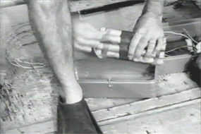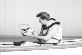 Wanda, a blonde, slinky item, intimates to George that he’d better get a move on, as she is leaving in two days. She orders him to stop Grant’s dive at all cost. George’s response is to attempt to sabotage the dive, by dropping pills into the airline of the diving equipment that Grant is borrowing from the College. I’m not sure how these are supposed to work; I assume they’re supposed to be poison, although they look more like aspirin. Remarkably, George proves himself psychic here, tampering with a second set of diving equipment, even though he couldn’t know that Ted would be going too.