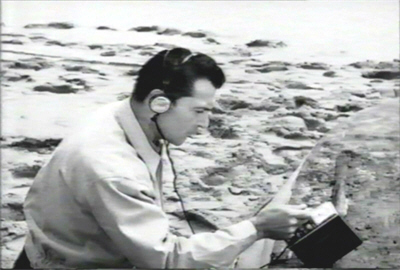 Another suit-wearer appears, identifying himself as William S. Grant, a Special Investigator for the Department of Defense, and compelling Suit #1 to identify himself as, “Ted Baxter, beachcomber and tourist”. Which I guess explains the suit. And as these two are exchanging pleasantries, a fourth person stumbles across the scene, being called out of his hiding-place in the bushes nearby by Grant.