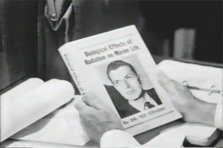 Ted having departed, King locks himself in his lab and draws from his briefcase a copy of that runaway best-seller, Biological Effects Of Radiation On Marine Life, by Dr Ted Stevens…which has as its cover-piece a huge head-shot of Ted. I honestly don’t know what’s funnier: that, as a book cover design, or the fact that Ted assumes a false identity to investigate the one person in California, possibly in the world, guaranteed to recognise him on sight.